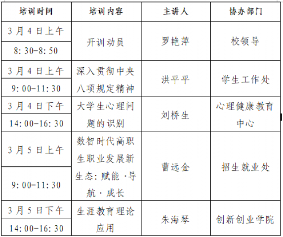 一、培训目的 本次培训紧扣党的二十大以来教育强国建设核心部署,立足新质生产力赋能教育改革背景,聚焦辅导员在数字化育人、协同育人、价值引领等新使命新要求。旨在进一步提升辅导员思想政治教育精准度、学生成长指导专业化、突发事件处置高效化水平,着力打造一支政治强、业务精、纪律严、作风正,兼具数字化素养与人文关怀的高素质辅导员队伍,为学校立德树人根本任务落地见效提供坚实保障。 二、培训主题 守正创新,赋能成长:新时代高校学生工作专题培训 三、培训时间与地点 培训时间:2026年3月4日至3月5日 培训地点:西一会议室 四、培训对象 全体专、兼职辅导员 五、培训内容