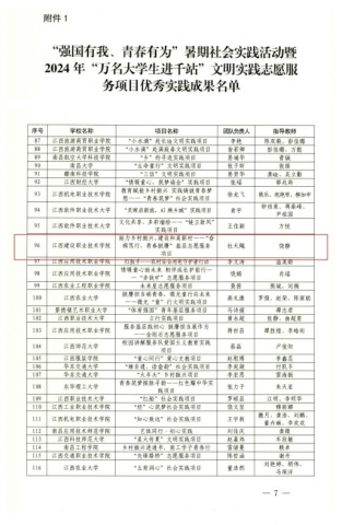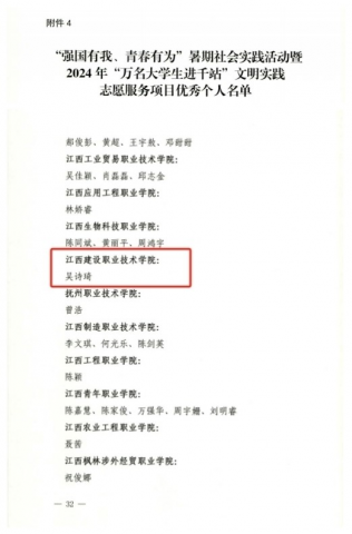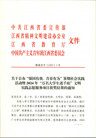 近日,江西省教育厅公布“强国有我、青春有为”暑期社会实践活动暨 2024 年“万名大学生进千站”文明实践志愿服务项目评选获奖结果。在此次评选中,我院饶静老师指导的助力乡村振兴,建设和美新村——“奋楫笃行,青春挺膺”基层志愿服务项目凭借出色的表现和扎实的工作成果,荣获“优秀实践成果”奖项;团队中建筑系筑D2305班吴诗琦同学获评“优秀个人”。这是我院首次在该赛项中获奖,实现了新的突破。